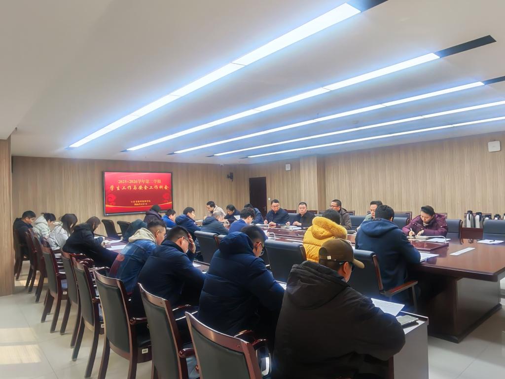 3月7日下午,我校在918会议室召开新学期学生工作会议,旨在全面总结上一学期学生工作成效,深入研判当前学生工作面临的新形势、新挑战,系统部署新学期学生工作重点任务,进一步统一思想、凝聚共识、压实责任,推动新学期学生工作有序开展。党委委员、副院长周青生出席会议并讲话,学工处、保卫处、团委等职能部门负责人,各二级学院学管副院长、学生科长参加会议,会议由学工处处长闫振主持。