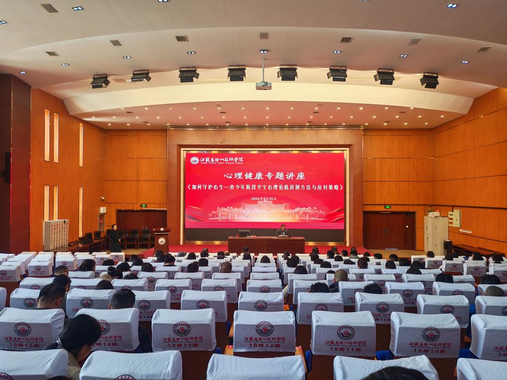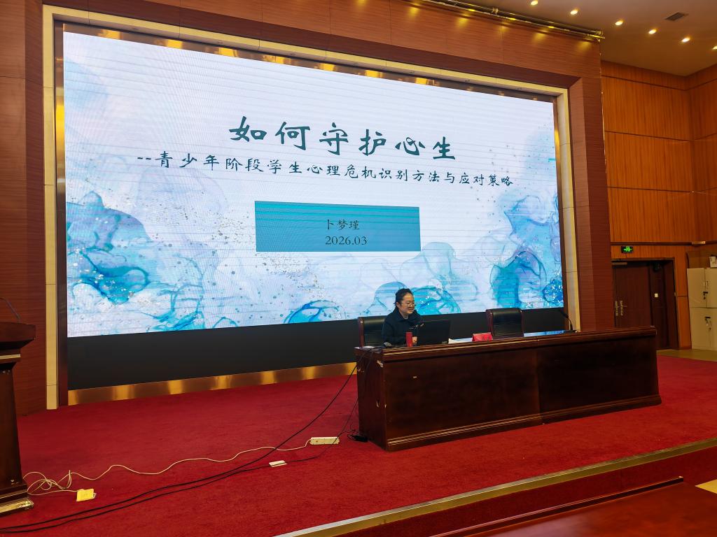 为进一步提升学管队伍心理健康教育专业能力,精准识别青少年学生心理危机,科学掌握应对策略,切实筑牢校园心理健康防线,3 月 25 日下午,我校特邀徐州工程学院大学生心理中心卜梦瑾老师,开展以《如何守护心生 — 青少年阶段学生心理危机识别方法与应对策略》为题的心理健康专题讲座。党委委员、副院长周青生出席活动,学生工作处相关人员,各二级学院学管干部、辅导员、学管员、班主任,宿管员及心理社团学生参加活动,活动由学生工作处处长闫振主持。