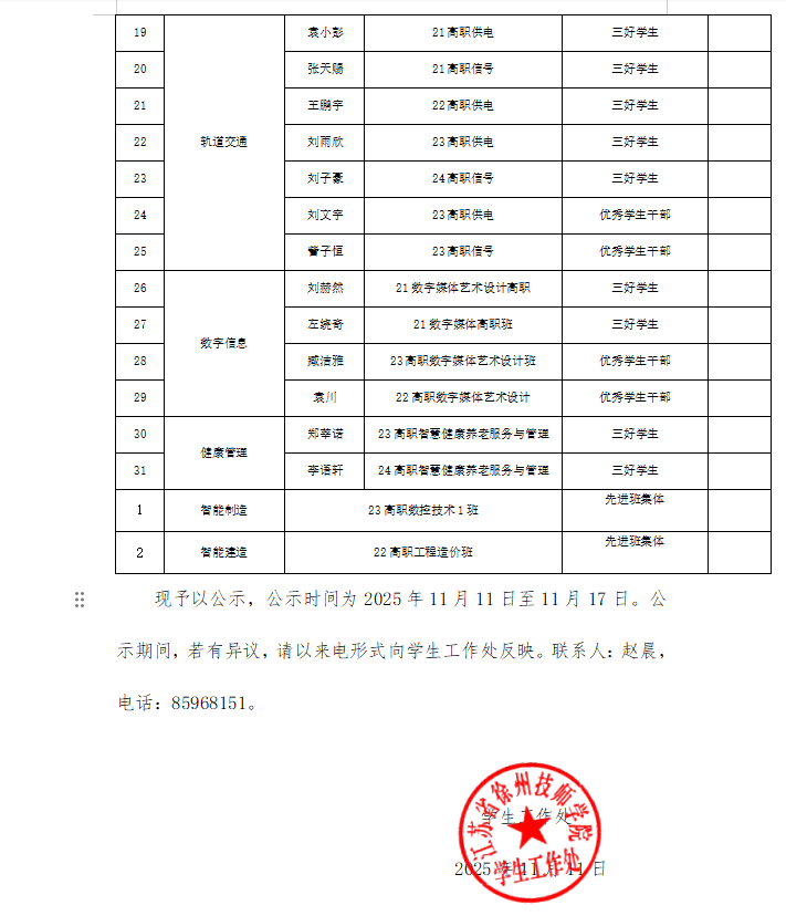 2025年度江苏联合职业技术学院三好学生、优秀学生干部、先进班集体推荐名单公示